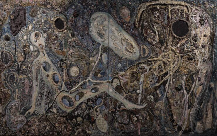 内臓のような森の中で巨大なキノコは死体を食べて分解し、人間は昆虫のように這いずりまわり土を食べている。絵の中の無数の穴は植物の呼吸のための気孔であり、生命体の生殖口であり、時として絵画自体が呼吸しているようだ。