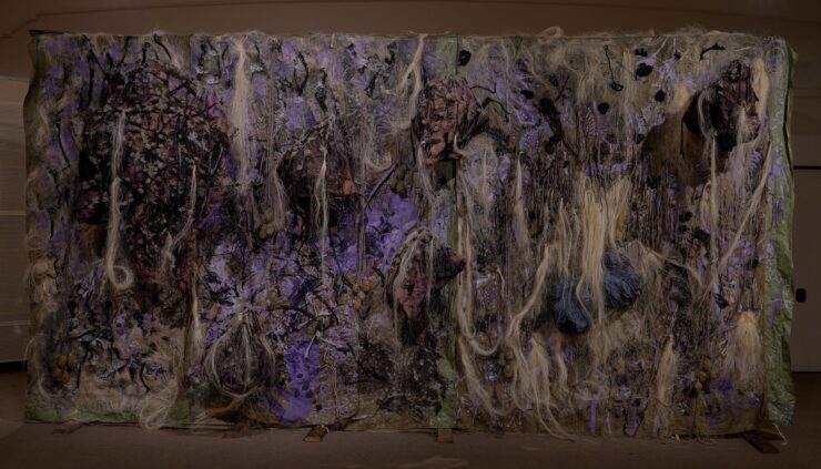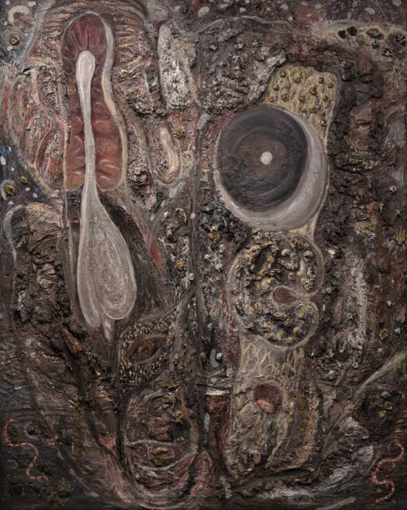 In a gut-like forest, giant mushrooms eat and decompose corpses, and humans crawl like insects and feed on the soil. The innumerable holes in the painting represent stomata for plants to breathe, or genital-like mouths for living organisms. Sometimes, the painting itself seems to breathe through the holes.