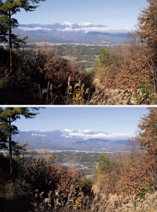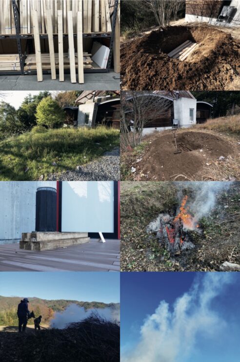 伊那谷を見下ろすと、天竜川にほど近い農地の一角から煙が立ち昇っている。2022年11月27日、アンフォルメル中川村美術館で開催中の横山昌伸の個展「来歴の煙」拝見後、煙を目指して車を走らせる。三州街道から天竜川に向けて少し下ると牧歌的な風景が広がる小さな集落がある。集落の先は行き止まりになっていて、そのいちばん奥の畑の近くで、横山に初めて会う。伐採した草木が燃やされ、展覧会で見かけた同形の角材から太古の狼煙のように濛々と煙が立ち昇っている。美術館との位置関係、土地の環境、土地所有者との交感、時間的制約、決して容易ではないこの場所の選定は横山の作品制作に大きく関わっているのではないかと感じた。横山の解説によると本展は3つのストーリーにひらかれていて、本作は「レディメイドの順応と転身の物語」だという。「レディメイド」とは「既製品」を意味し、マルセル・デュシャンが1915年に既製品を用いた作品の表明の形式を定義するために使った言葉であるが、本作とはその意味において差異があるように思えた。美術館の庭には複数の角材が埋められていた跡が残る穴があり、美術館外部のデッキには掘り出されたであろう、部分的に土が残る角材が2本置かれていた。それぞれ〝埋められたレディメイド〟、〝掘り起こされたレディメイド〟であり、目の前ではおそらく〝煙になったレディメイド〟が実践されている。展覧会のフライヤーの解説にある「既存の眼差しや言説を形のないレディメイド=フォーマットとしてとらえ、それを乗り越える作品制作を目論む」横山の実践は、デュシャンの「レディメイド」と関係を持つのか、展覧会名「来歴の煙」とは何を意味しているのかという疑問を残し、立ち昇る煙を後にした。